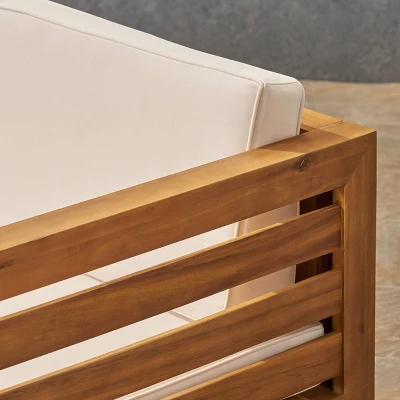 Whether you are sprawling out under the summer sun or having guests over for a mid-day refresher, this Christopher Knight Home Cambridge 5pc Acacia Wood Sofa Set has you covered in both impressive style and comfort. This set includes a three-seater sofa, an ottoman, and a coffee table, making this set perfect for hosting small outdoor get-togethers or just for lounging about outside with a good book. Featuring a wooden open-slat frame and fresh cushion colors, this Christopher Knight Home Cambridge 5pc Acacia Wood Sofa Set brings a timeless look to any outdoor space that will last for years to come.