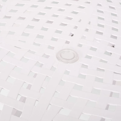 Seat your guests around a table that has plenty of space for them to enjoy a hearty meal and delightful conversations. Crafted from durable cast aluminum and finished with a graceful lattice pattern accented with floral carvings, our dining table offers both charming style and outstanding strength, making this a perfect addition to any outdoor space. This piece is complemented by elegantly curved legs and a convenient umbrella hole in the tabletop, allowing you to utilize this table in any weather.