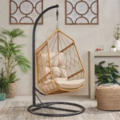 Allegra Outdoor Wicker Hanging Chair With Stand – Light Brown/Tan – Christopher Knight Home